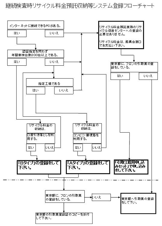 自動車リサイクルシステムへの事業者登録申請書類が、自動車リサイクル促進センターから届きました。下記のフローチャートをご参考の上、振興会各支所で必要書類をお受け取り下さい。