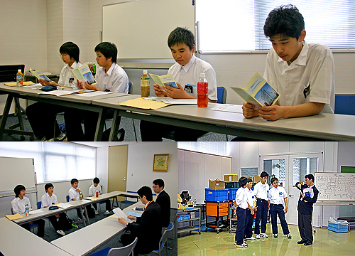 平成19年5月18日(金)、登米市立佐沼中学校(宮城県)の3年生4名が、自動車の「エンジンのしくみ」や「部品の数」、「認証工場」「指定工場」「保安基準」等、自動車整備業に関する学習をすることを目的に自動車整備教育会館を訪れた。