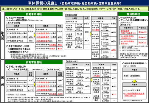 平成27年3月31日(火)、参議院本会議において「所得税法等の一部を改正する法律案」及び「地方税法等の一部を改正する法律案」が可決・成立しました。 これにより、自動車取得税及び自動車重量税などの車体課税について、平成27年4月1日(自動車重量税については5月1日)より一部見直しが適用されます。 なお、詳細につきましては以下をご参照ください。 ◆平成27年税制改正における車体課税見直しの概要