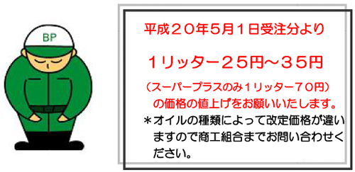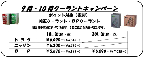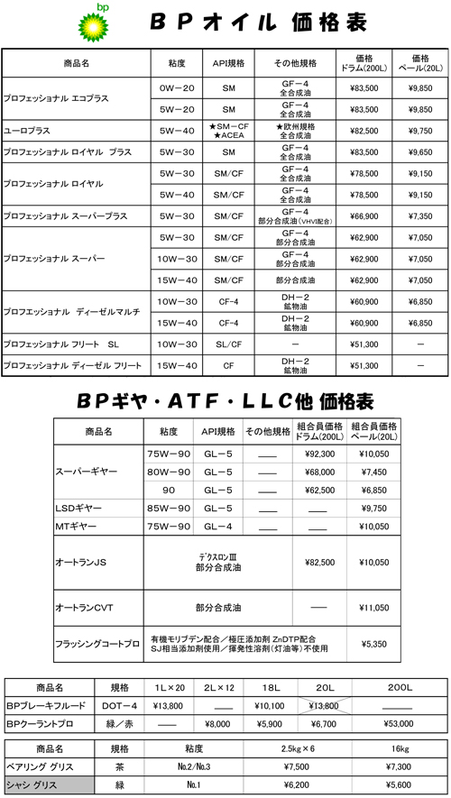 いんふぉめーしょん10月号でお知らせいたしましたとおり、最近の原油高騰のあおりを受け、11月1日よりBPクーラント(アミンフリー防錆剤タイプ)、BPブレーキフルード(DOT−4)が下記の通り値上げとなりました。
