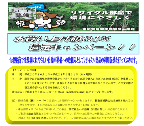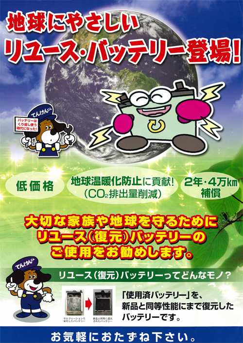 都整商では地球環境にやさしいリユース(復元)バッテリーの取扱い登録店を募集しております。新品同様の2年もしくは4万キロ補償、しかも格安のバッテリーです。特に中古車、リース車、又は高年式車に最適です。詳しくは各支所までお問い合わせください。尚、既に登録していただいている組合員工場に本バッテリーのユーザー向けポスター・チラシ等を用意しましたので各支所にてお受け取ください。