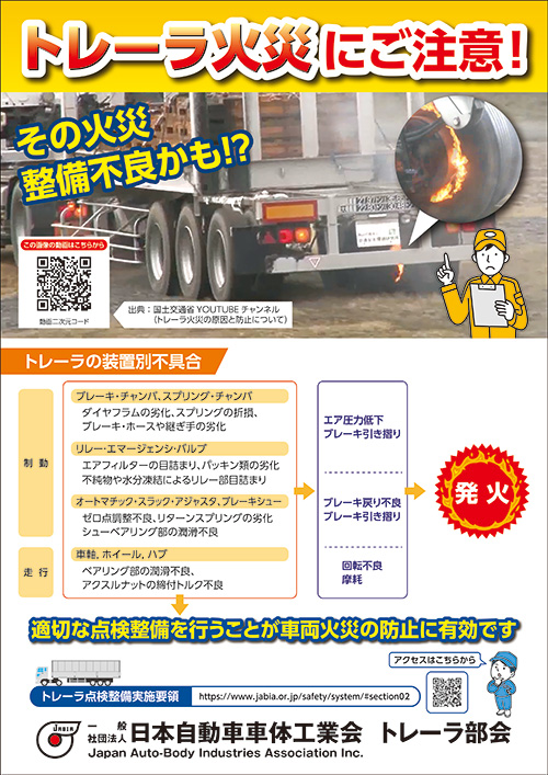 (一社)日本自動車車体工業会では、トレーラ火災への注意喚起および予防整備促進のためのチラシを作成し、公開しました。