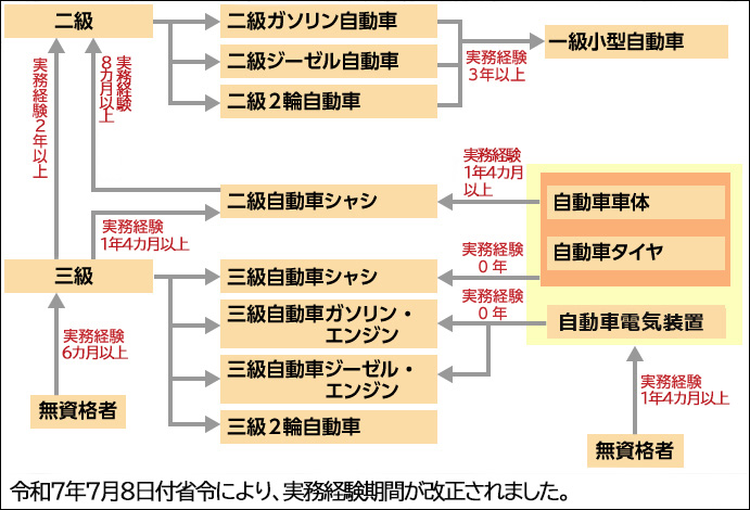 学科試験日の前日までに、下表に掲げる自動車の整備に関する実務経験が必要になります。