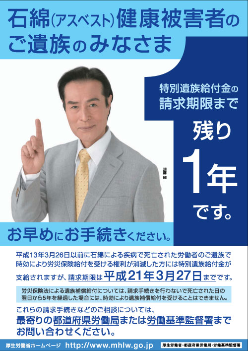 厚生労働省より日整連を通じて当会に対し、当会会員組合員に石綿による被害の救済に関する「特別遺族給付金」を周知するよう要請がありました。 「石綿による健康被害の救済に関する法律」に基づく「特別遺族給付金(特別遺族年金または特別遺族一時金)」は、本法律の施行後3年以内に請求しなければならず、この請求が平成21年3月27日に請求期限を迎えること、また、石綿による疾病については、発症までの期間が長く、労働者、医師双方において石綿ばく露と発症との関連性についての意識がないまま労災請求に及んでいない場合があるため注意が必要です。