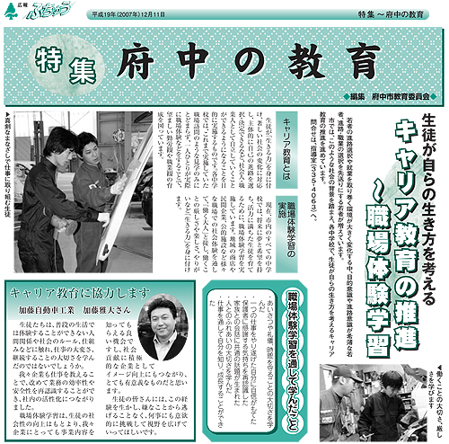 当会では、都が推進する職場体験事業に協力するため、「中学生の職場体験推進協議会産業団体」となり、協力していただける会員に「作業用つなぎ」等の提供を行っているが、今般、職場体験を受け入れていただいた加藤自動車工業(有)(加藤代己代表取締役、府中支部)が府中市の広報紙「広報ふちゅう(2007年12月11日号)」において紹介された。 職場体験学習は、「将来の社会人」である中学生に、正しい人生観・勤労観・職業観を充実させ、不登校児童やフリーター、ニートの増加、社会生活における実体験の減少や社会規範の喪失などの解決方策として、東京都が全中学2年生を対象に実施しているもの。 今回生徒を受け入れた同事業場の加藤雅大氏は、「職場体験学習は、生徒の社会性の向上はもとより、我々企業にとっても事業内容を知ってもらえる良い機会ですし、社会貢献に積極的な企業としてイメージ向上にもつながり、とても有意義なものだと思う」と述べ、今後も積極的に中学生の職業体験学習を受け入れたいとしている。