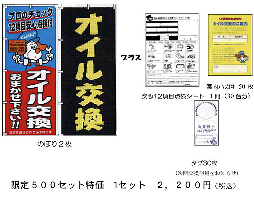 消耗品の中で比較的入庫頻度の高いオイル交換をお客様にお勧めすると同時に、安心点検12項目の点検を組み込むことで、入庫促進を図る「安心点検付きオイル交換ツール」をご提案します。 限定500セットの販売ですので、東整振各支所窓口にてお早めにご注文下さい。