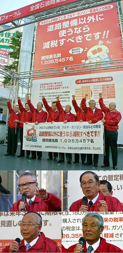 当日は、日本自動車連盟 田中 節夫会長、自動車税制改革フォーラム 張 富士夫会長、石油連盟 渡 文明会長、全国石油商業組合連合会関 正夫会長等がステージにおいて「クルマに関する税金を道路整備以外に使うなら、減税すべき」とシュプレヒコールを繰り返した後、街頭に移動しチラシやパンフレットを通行者に配布。複雑で自動車ユーザーの負担が重いクルマとガソリンにかかる税金の見直しについて理解を求めた。