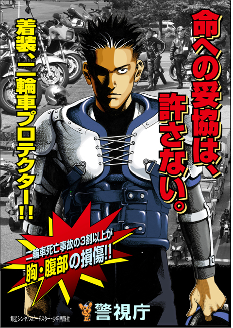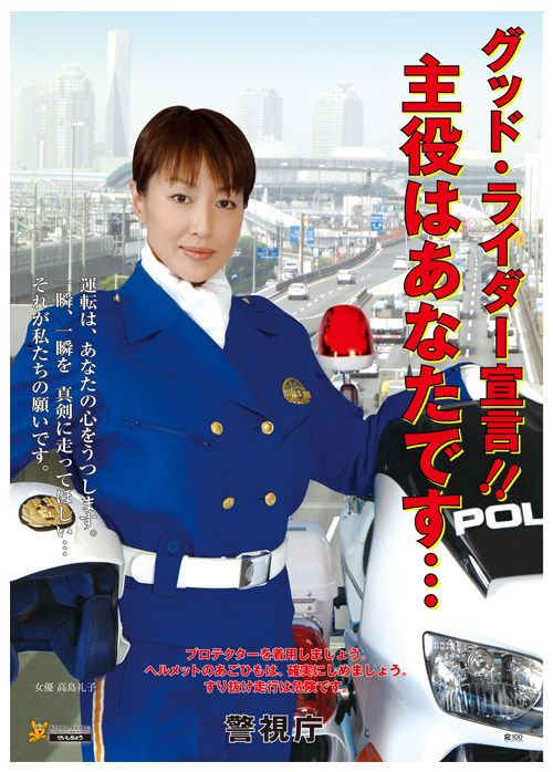 警視庁は、交通安全啓発活動の一環として女優の高島礼子さんを起用した「グッドライダー宣言!! 主役はあなたです…」ポスターと、漫画家の飯星シンヤさんが描く「命への妥協は許さない。 装着二輪車プロテクター」ポスターを作成した。