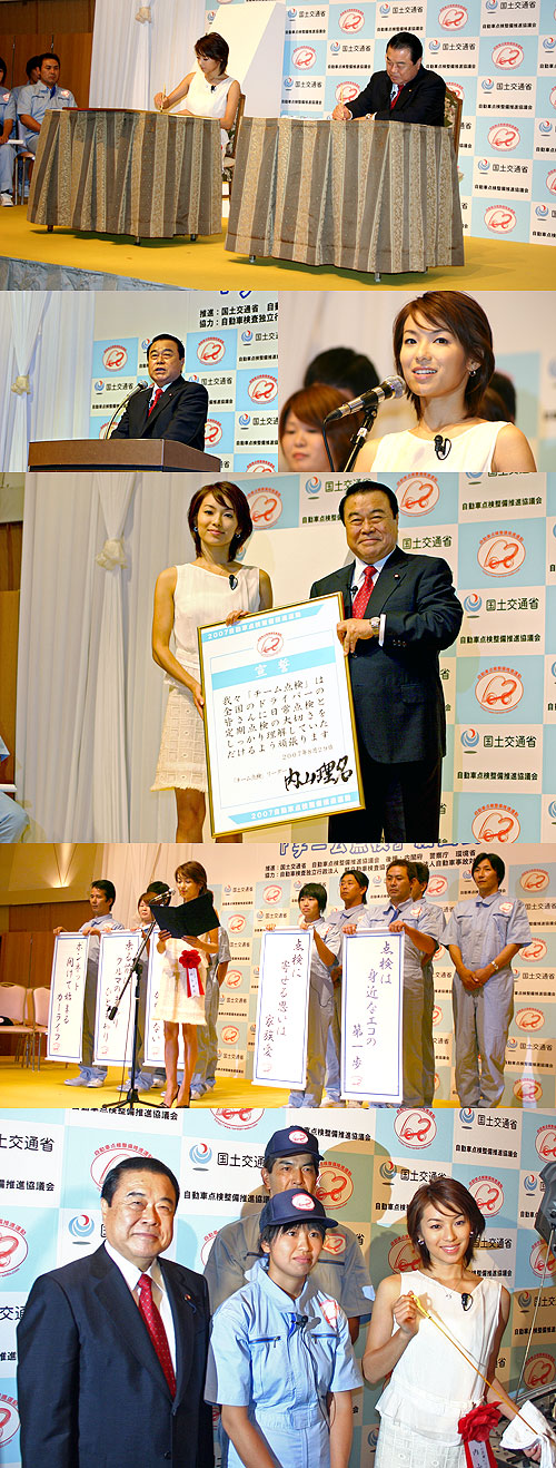 平成19年8月29日(水)、自動車点検整備推進運動強化月間に先立ち、虎ノ門パストラルホテル内において、一級自動車整備士等から構成される「自動車点検整備推進運動『チーム点検』結団式」が開催された。 結団式内で冬柴鐵三国土交通大臣から「チーム点検」リーダーに任命された女優の内山理名さんは、大臣に決意表明を行い、内山さんがサインをした宣誓パネルを大臣に手渡した。 内山さんによって「点検推進川柳」が発表され、その後、点検講座として「チーム点検」メンバーである自動車整備士の指導の下、エンジンルームの点検デモンストレーションが行われ、内山理名さんは日頃の点検整備の重要性について深い理解と関心を示していた。