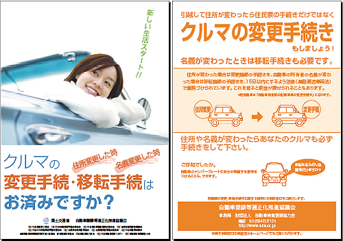 国土交通省と自動車関係機関で構成する自動車登録等適正化推進協議会は、総務省並びに警察庁のご協力を得て、引越等に伴い住所変更をした際や所有者の名義等を変更した際の自動車の変更登録、移転登録等の手続きの的確な実施と法の遵守に向けての啓発活動を実施しておりますが、平成18年度においてもリーフレットを作成し、平成18年10月と平成19年2月の2回にわたり関係機関に配布し、自動車ユーザーへの周知に努めることとしております。 つきましては、活動の趣旨をご理解いただき、リーフレットの有効活用を宜しくお願い申し上げます。 ・クルマの変更・移転手続きはお済みですか?(自動車登録等適正化リーフレット)